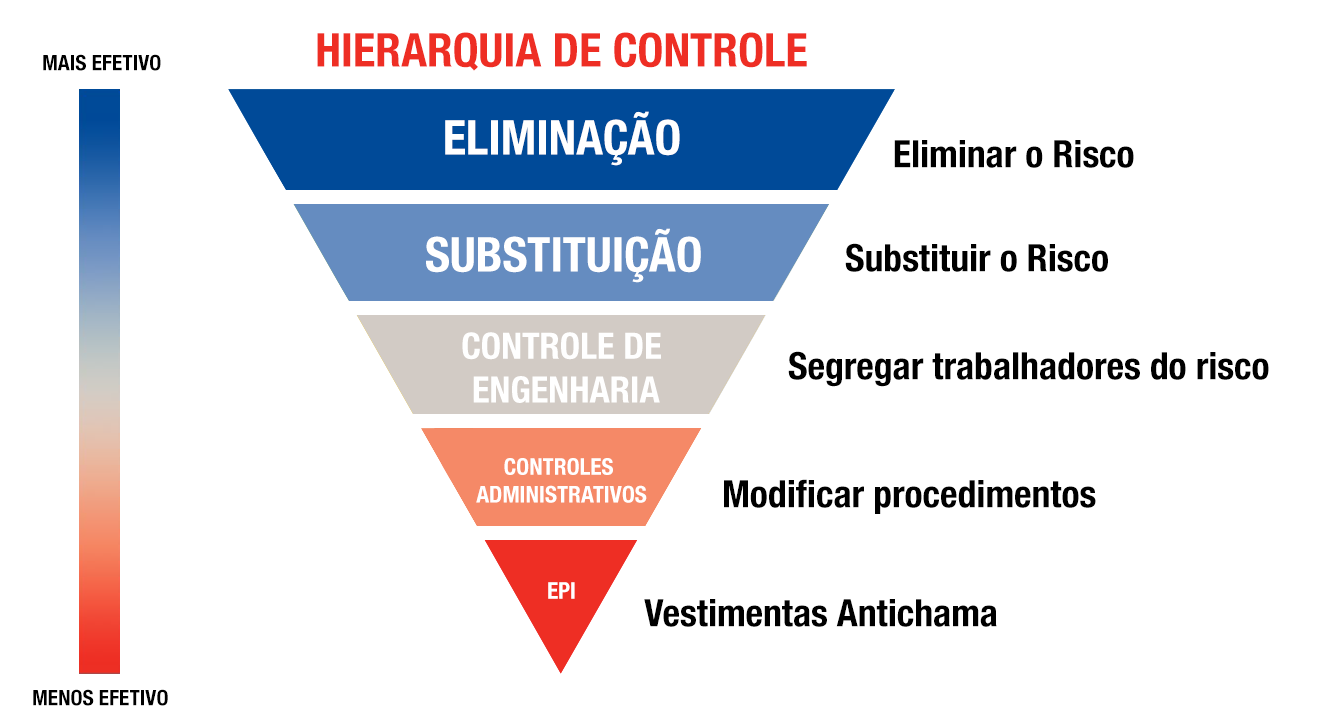 A hierarquia de controles de riscos é uma parte fundamental desse processo e, embora a primeira prioridade seja sempre a eliminação do risco, a hierarquia incentiva uma abordagem holística para o desenvolvimento de práticas e procedimentos de segurança. A vestimenta antichama é a última linha de defesa e a salvaguarda fundamental que suporta toda a hierarquia, devida à sua capacidade de fornecer proteção na ocorrência de um arco elétrico.