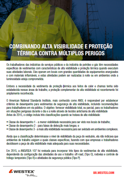 Os trabalhadores das indústrias de serviços públicos e da indústria de petróleo e gás têm necessidades específicas de vestimentas com características de alta visibilidade e proteção térmica quando executam suas atividades laborais. Eles operam em locais com grandes quantidades de equipamentos energizados e com materiais inflamáveis, e estas atividades podem ser realizadas à noite ou em ambientes onde a luminosidade esteja comprometida.