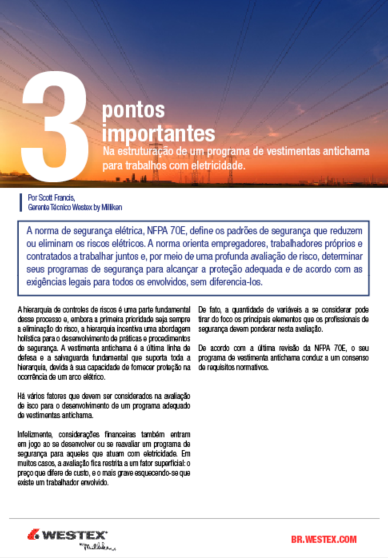 A norma de segurança elétrica, NFPA 70E, define os padrões de segurança que reduzem ou eliminam os riscos elétricos. A norma orienta empregadores, trabalhadores próprios e contratados a trabalhar juntos e, por meio de uma profunda avaliação de risco, determinar seus programas de segurança para alcançar a proteção adequada e de acordo com as exigências legais para todos os envolvidos, sem diferencia-los.